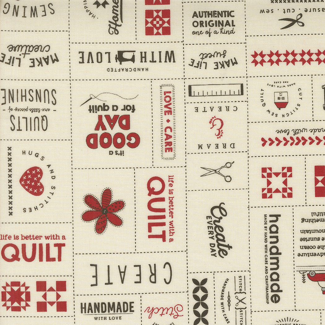 Celebrate the art of creation with Moda. This range presents a charming collage of sewing-themed designs each featuring a delightful illustration or heartfelt phrase, all rendered in a sophisticated palette of black and warm cream. The effect is one of cherished memories and the enduring joy of making. This fabric provides a narrative backdrop that speaks to the heart of every crafter, perfect for quilting projects, sewing accessories, or decorative pieces that celebrate the passion. sold in minimum 1/2 meter lengths